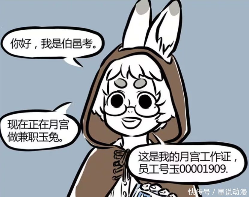 这只兔子是伯邑考,现阶段在月宫做兼职玉兔。伯邑考在月宫有工作证,员工编号是玉00001909。看来这是月宫第1909只玉兔,小玉编号肯定是玉00000001。那么伯邑考来这里干什么?