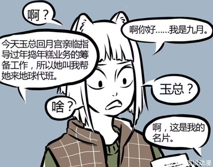 伯邑考告诉九月,玉总回到月宫,亲临指导过年的年糕业务筹备工作,所以她让伯邑考来代班。九月也告诉了伯邑考的名字,不过她更诧异的是为何叫小玉为玉总?此时九月还不知道小玉掌管月宫八千万多只玉兔,所以才会吃惊。伯邑考也有名片,地位仅次于小玉。